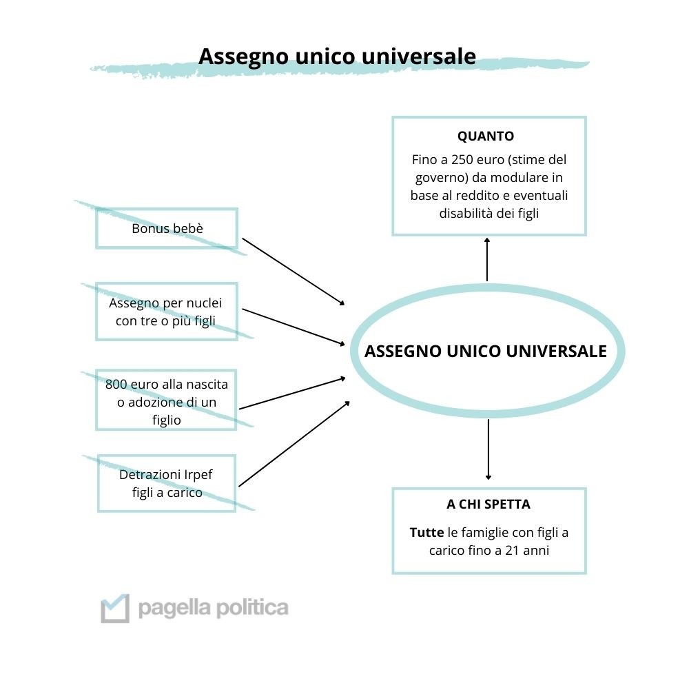 Secondo quanto annunciato dal presidente del Consiglio Mario Draghi e dalla ministra per le Pari opportunità e la Famiglia Elena Bonetti (Italia viva), il contributo mensile avrà un valore di circa 250 euro – gli importi esatti dovranno comunque essere definiti in futuro – e potrà essere richiesto a partire dal 1° luglio 2021. La riforma è attesa da anni e prevede che il nuovo sussidio assorba tutte le differenti misure a sostegno delle famiglie finora in vigore, in questo modo semplificandone l’accesso.