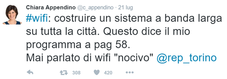 In risposta alle polemiche sul “taglio del wi-fi”, Chiara Appendino ha chiarito la propria posizione in un tweet: